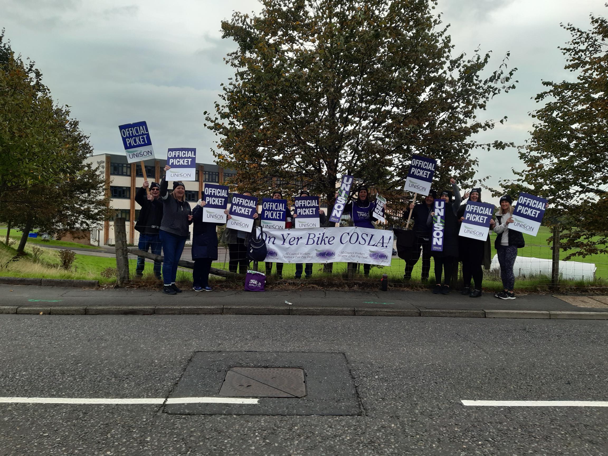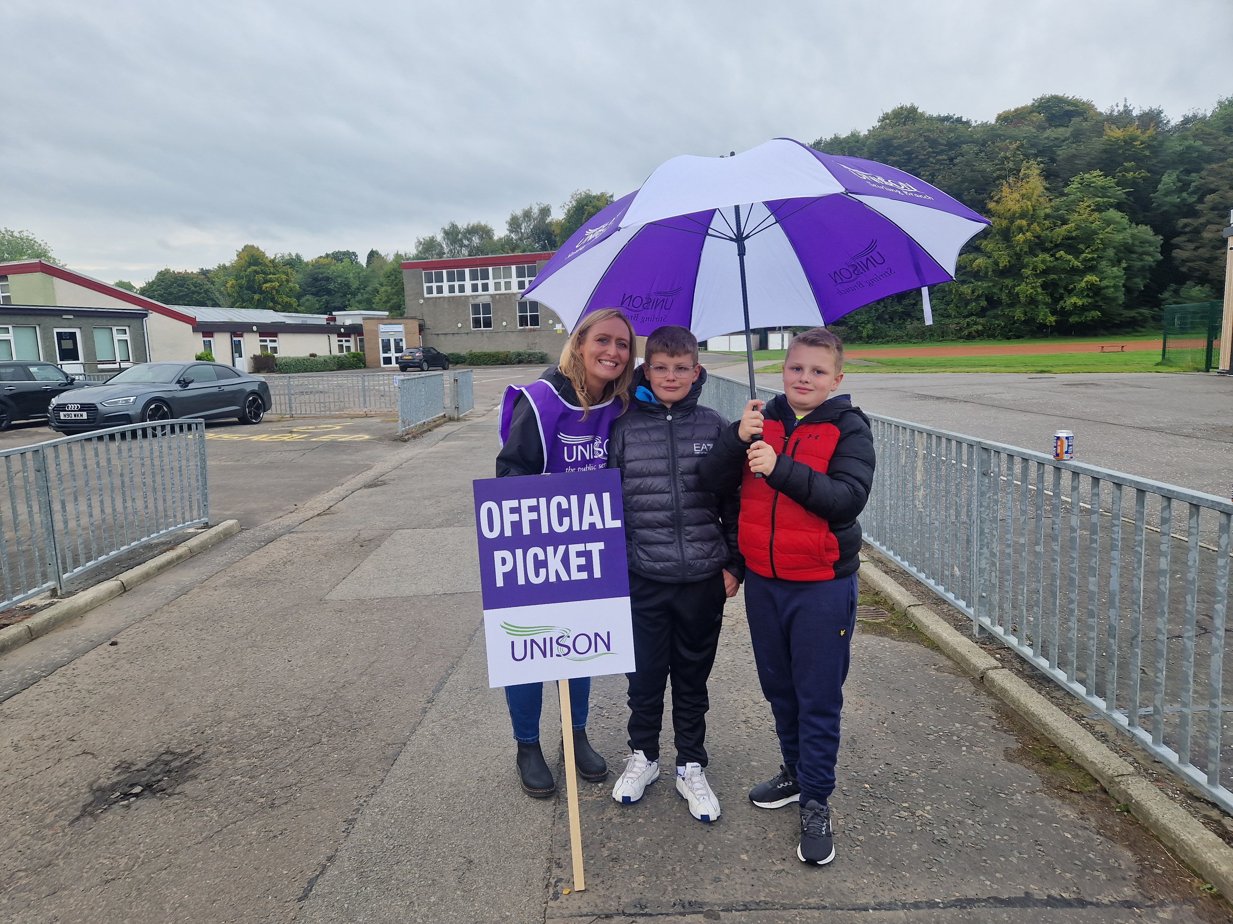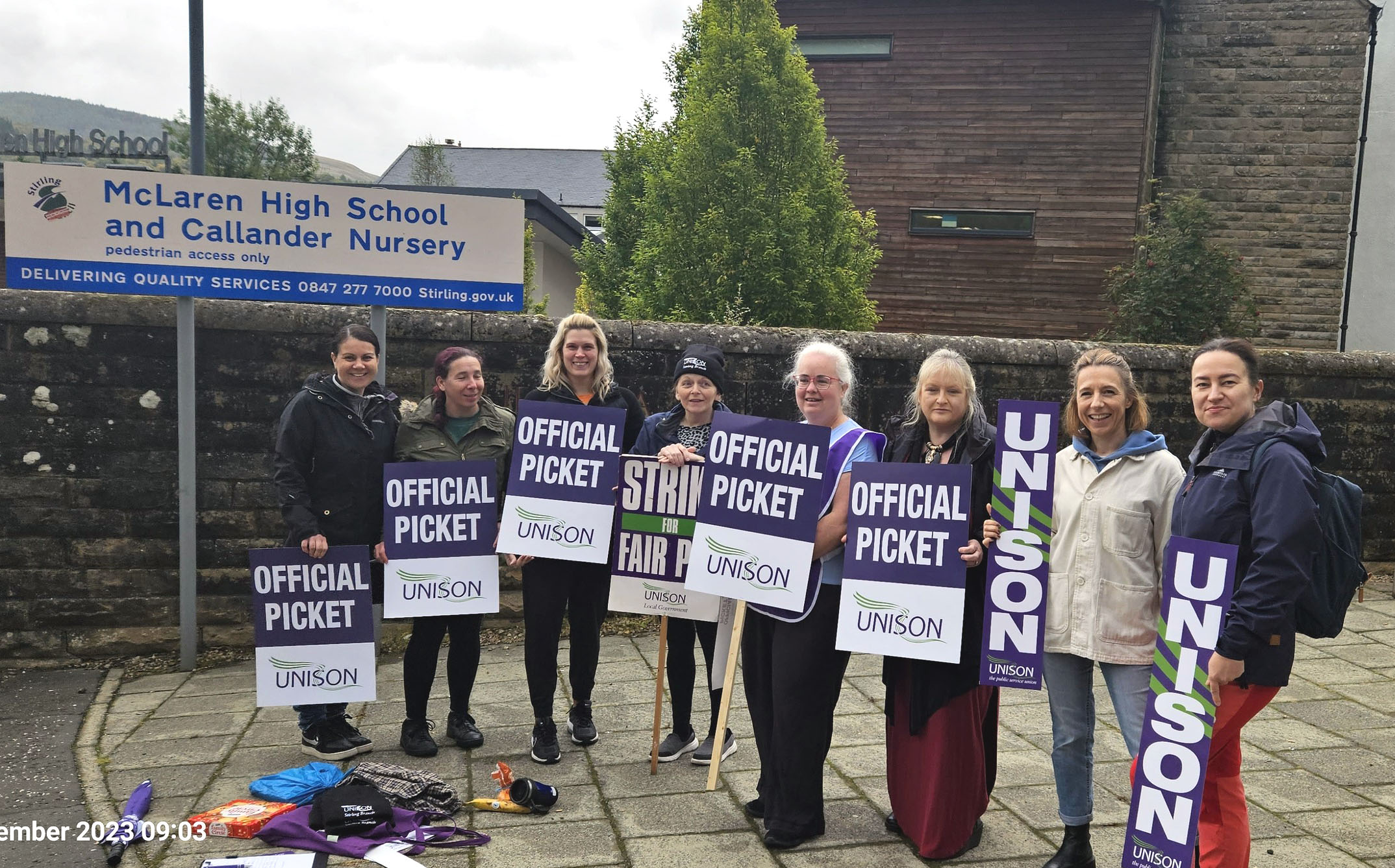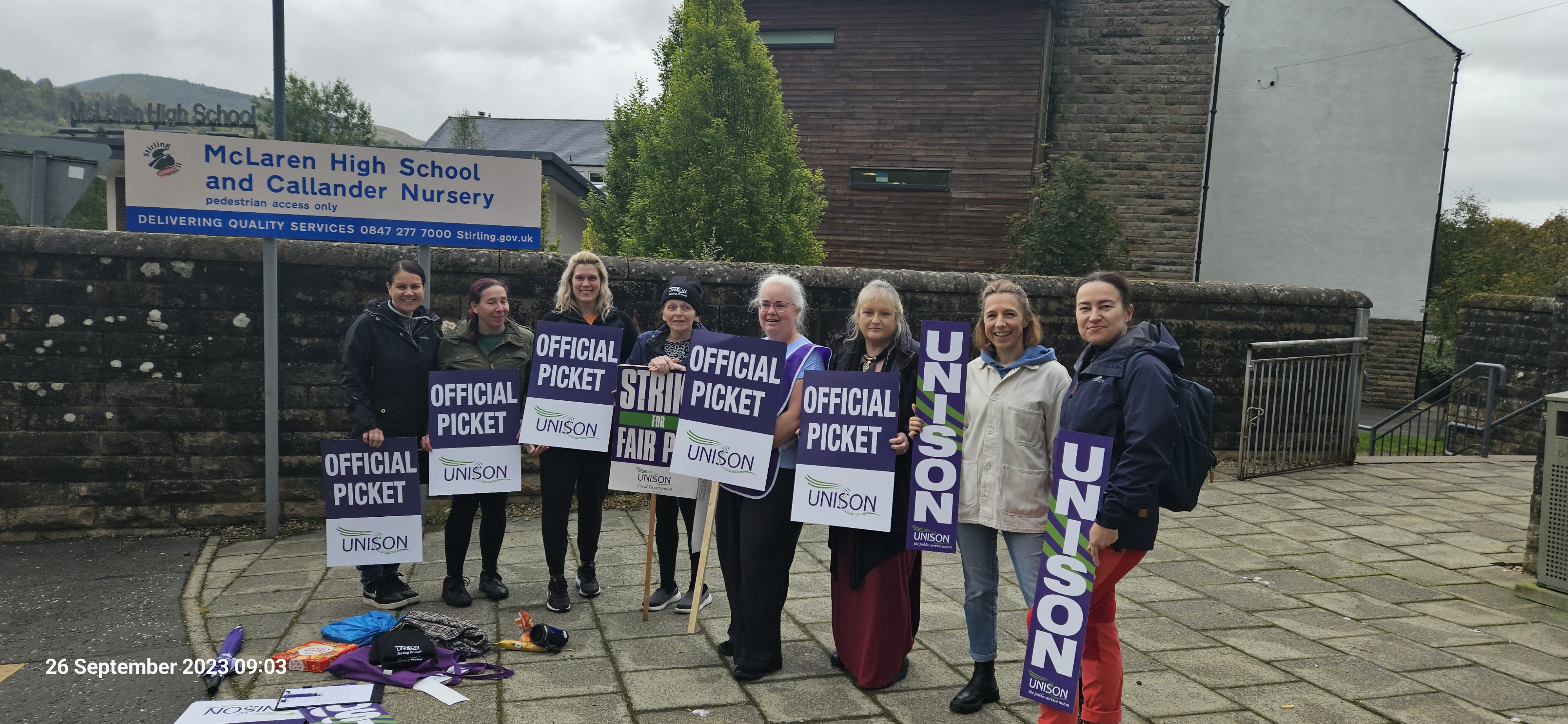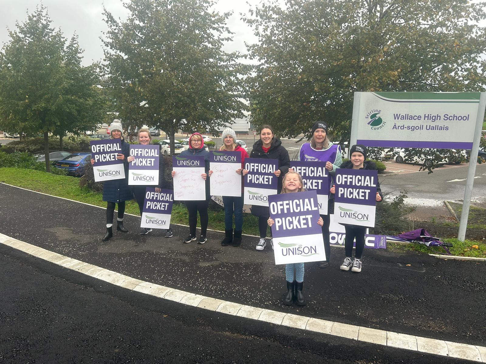 This week we have seen our fellow workers from Schools and Early Years settings on the picket lines striking for Fair Pay for all. Bannockburn Primary and High School, Balfron High, Braehead, Borestone, Callander, Fallin Primary, Raploch Campus, St Ninians Primary and Nursery, Stirling High, McLaren High, and Wallace High all came out on 26, 27, and 28 September, many bringing their children and some also brought their dogs along.
